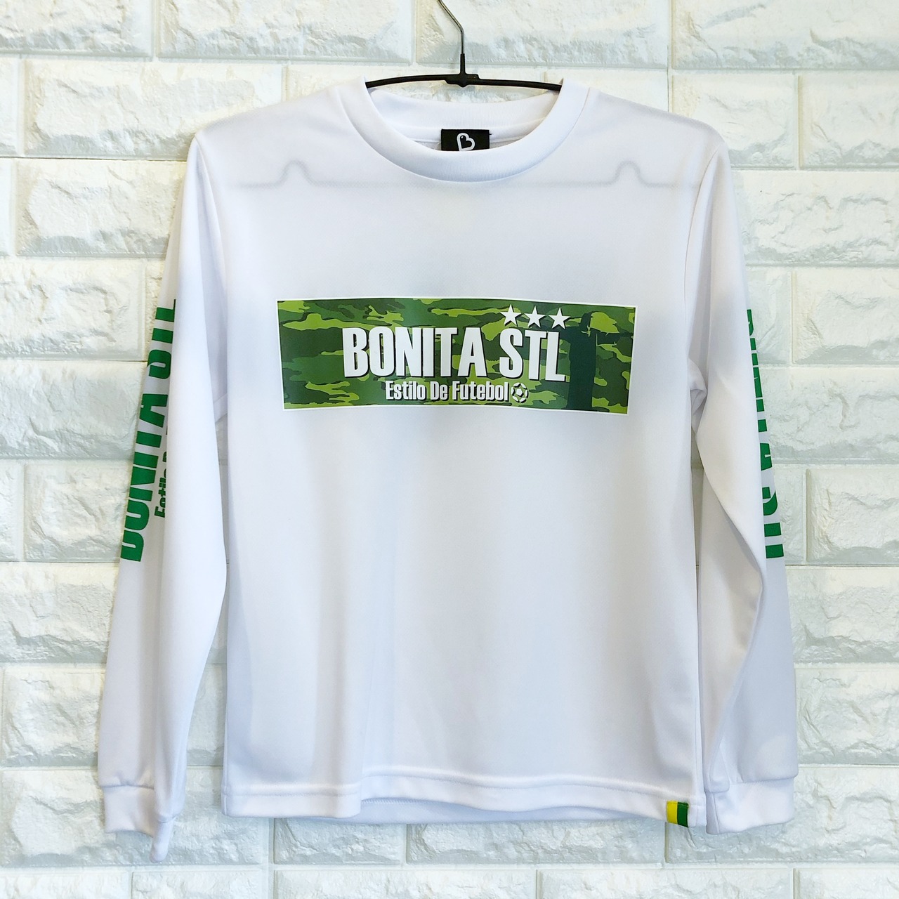 両袖にはシンプルに、そしてフロントにカモフラージュロゴが入り、背中には『Joga Bonito』のロゴが入ります。Joga Bonitoとはポルトガル語で『美しく遊べ』という意味になります。このフレーズはブラジルサッカーの代名詞的は言葉で、サッカープレーヤーやサッカーファンに方々へそも想いを込めてデザインしました。