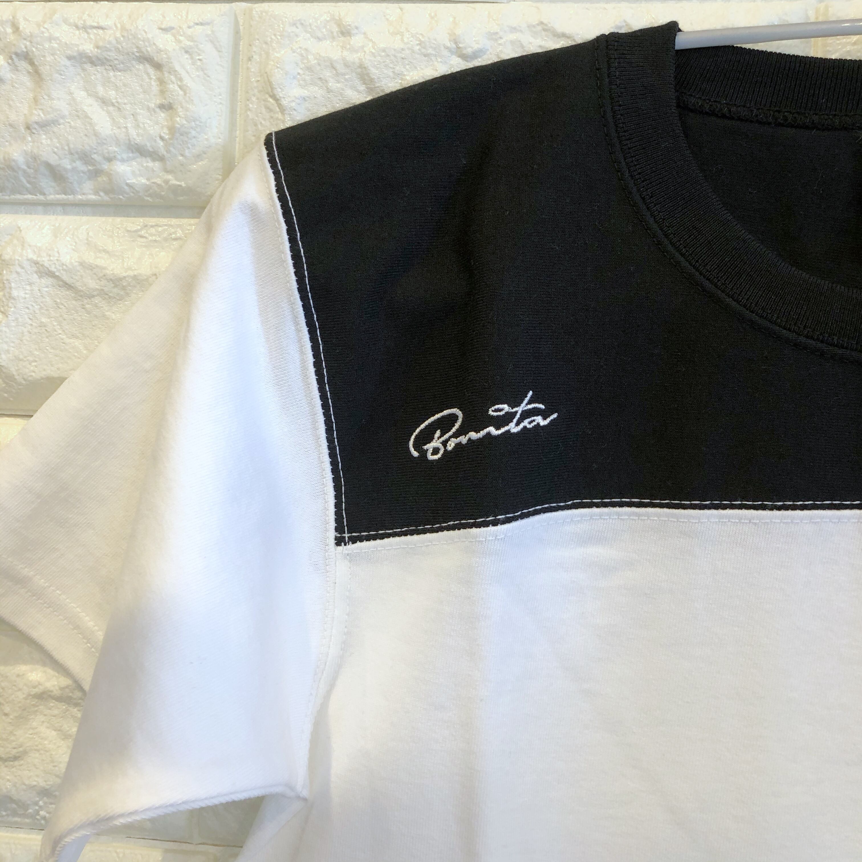 上下の切り返しで違うイメージを出せるこのTシャツにはBonitaのロゴをさりげなく刺繍加工してあります。身幅が若干タイト目な作りになっていて、きれい目なスタイリングになります。
